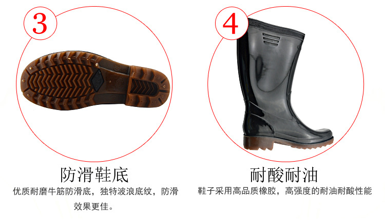 華特南峰060高筒安全靴根據人體工程學原理,更好的修飾腳部線條;精選優質橡膠,柔韌性特別強,防水耐磨,穿著舒適。加厚鞋跟,比一般的鞋子更厚實,耐磨。優質耐磨牛筋防滑底,獨特波浪底紋,防滑效果更佳。