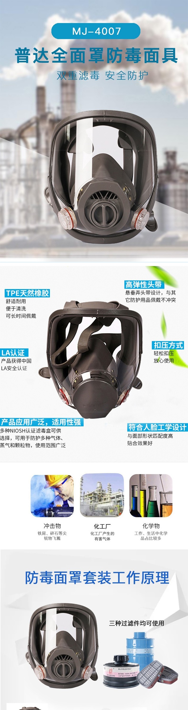 普達 MJ-4007防毒全面具采用TPE天然橡膠,舒適耐用,便于清洗,可長時間佩戴;