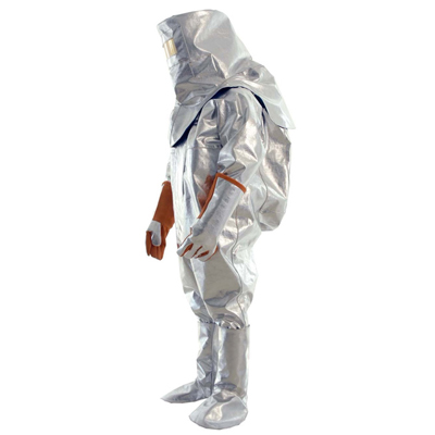 隔熱服符合歐標EN366、EN367、EN373標準,服裝表面采用鍍鋁隔熱面料(不含石棉),頭罩可單獨配
