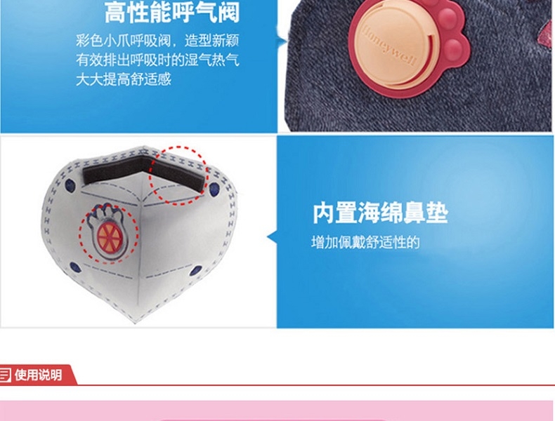 霍尼韋爾D7051SV-B10萌寵男孩防塵口罩可調節鼻梁夾;棉質彈性耳帶;優質過濾材質;高性能呼吸閥;內置海綿鼻墊。