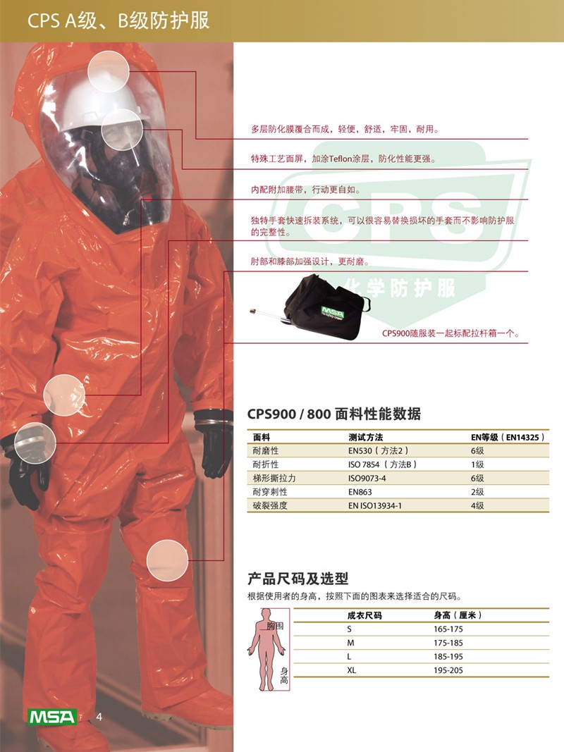 梅思安10124983CPS800防化服由多層特制的防化聚合物覆合而成,達(dá)到優(yōu)佳的化學(xué)防護(hù)性能及優(yōu)異物理面料性能,配合內(nèi)置空氣呼吸器使用,可提供Level B(B級(jí))防護(hù)。