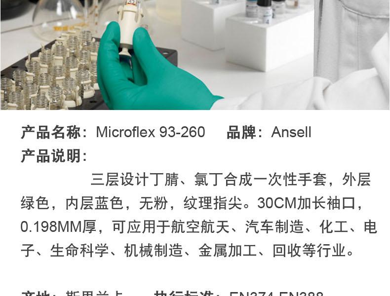 Ansell安思爾93-260MICROFLEX丁腈手套標準與認證:III類; EN 420:2003 + A1:2009;FDA21 CFR 177-2600
